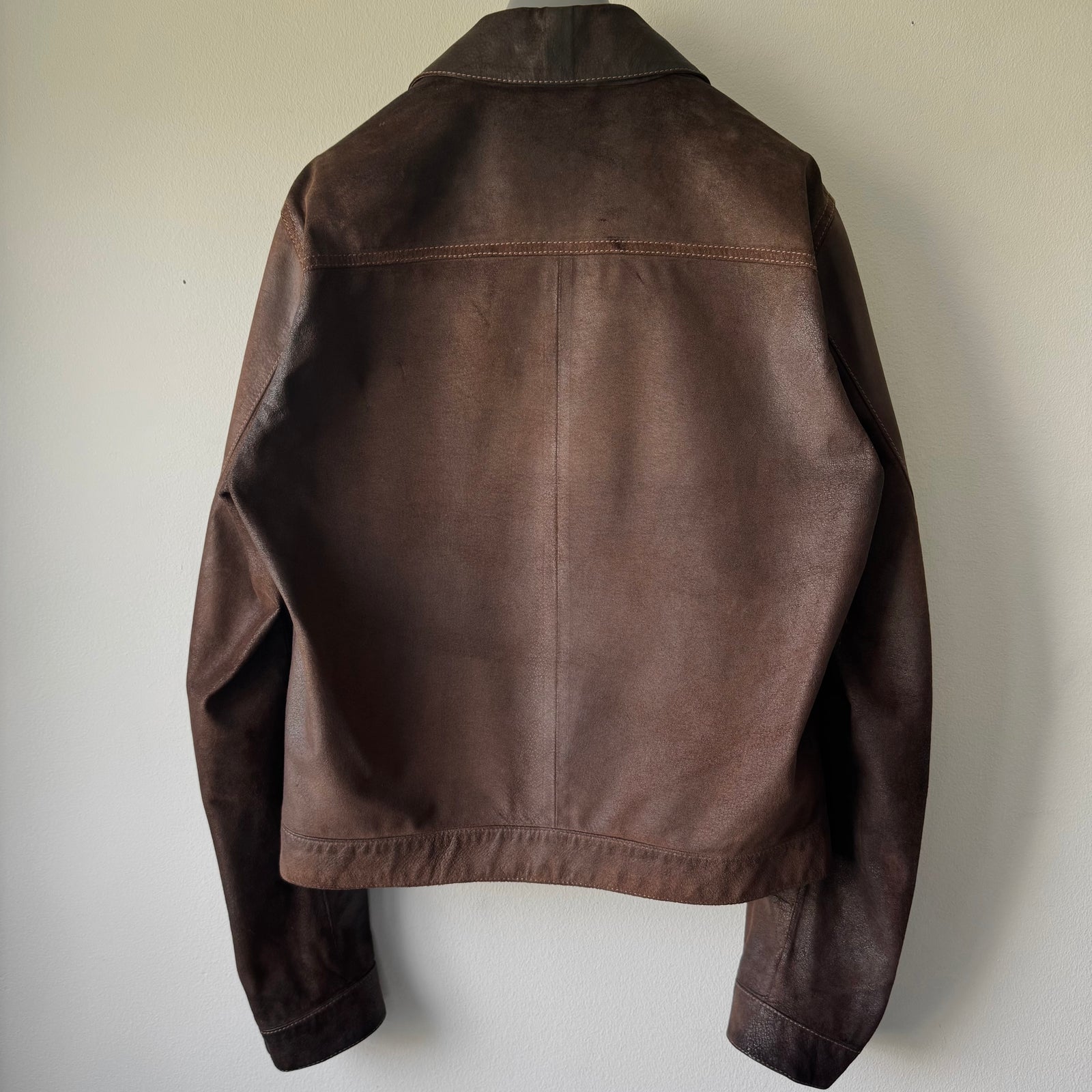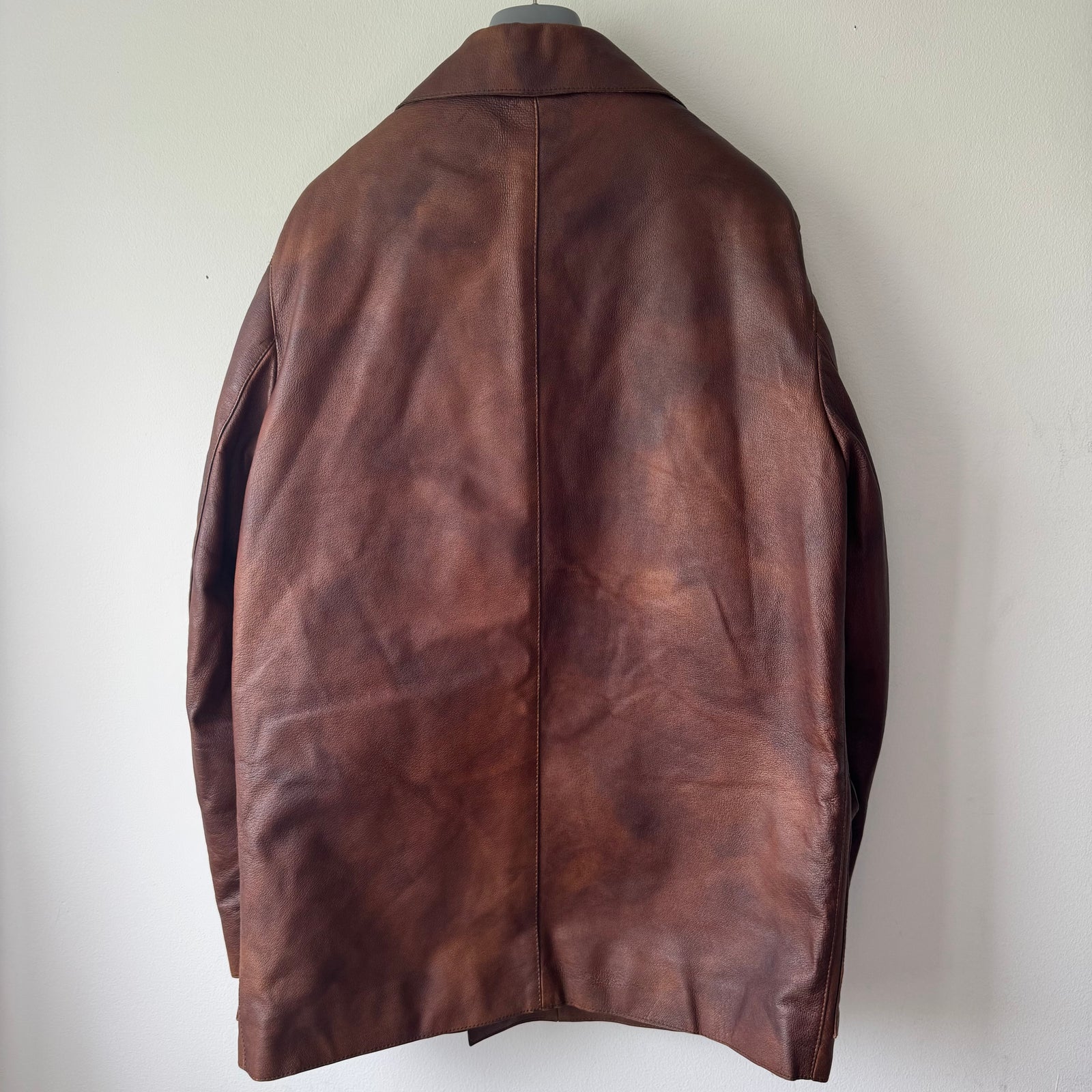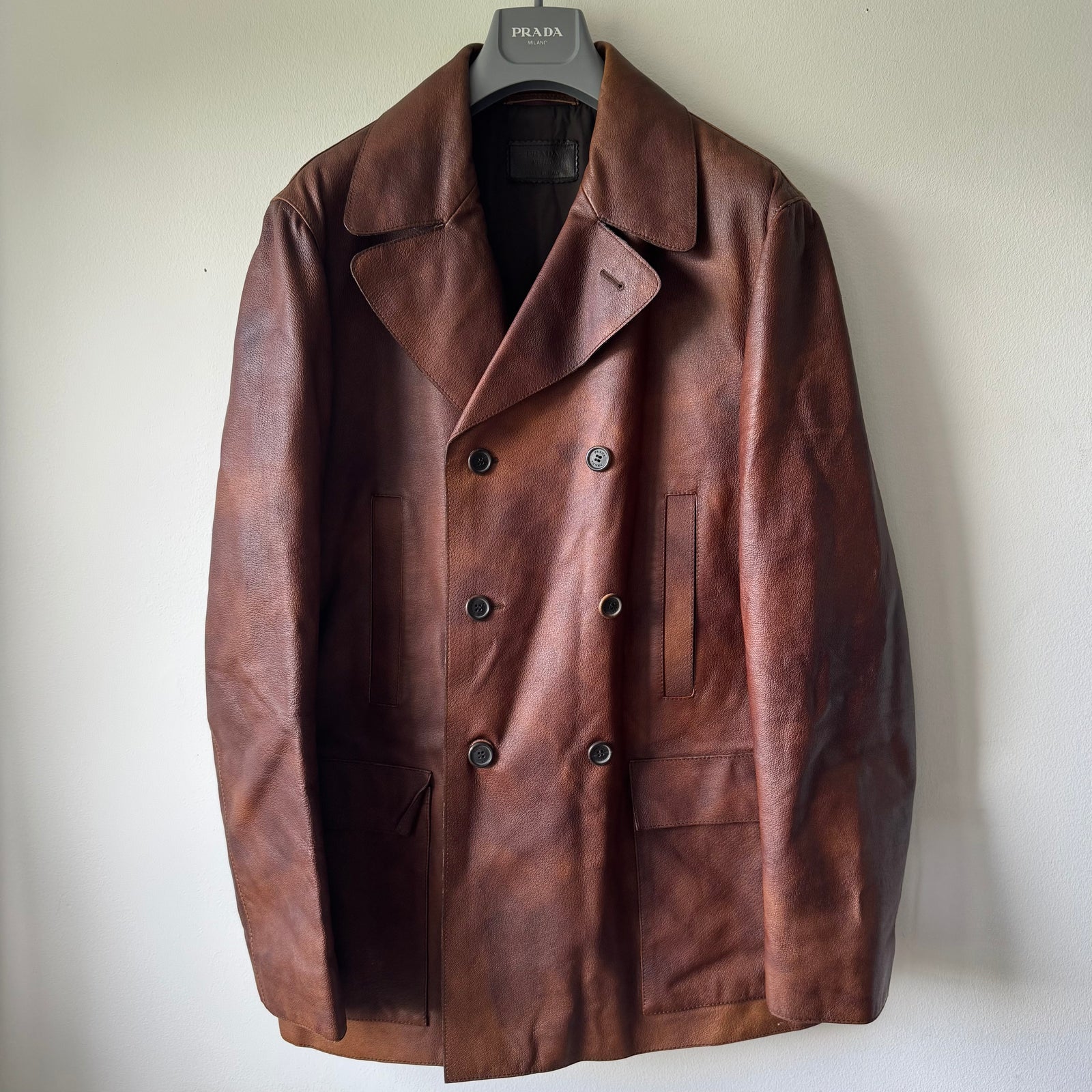 Prada 2000’s Double Breasted Patina Leather Overcoat Jacket